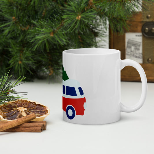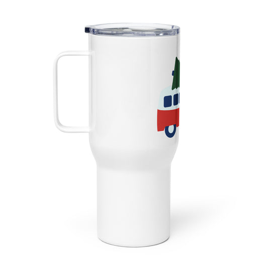 Travel mug with a handle featuring a retro camper van carrying a Christmass Tree